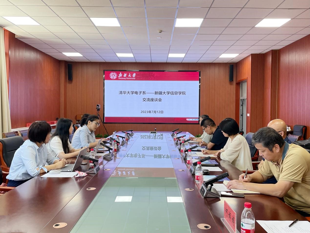 李冬梅首先对学院的热情接待表示感谢,同时代表清华电子系对援疆教师学院常务副院长何亮表示慰问,然后介绍了清华大学电子系的概况、本科生与研究生课程体系和培养模式、特色培养项目与科研成果转化的经验;学院党委委员、计算与数据中心主任张振宇,副院长刘胜全和信息安全系主任刘淑娴分别介绍了研究生导师队伍、本科生实践和人才培养等方面的情况和遇到的问题。双方就专业型研究生培养、招生及国际化交流等方面的工作进行了深入交流,共同探讨了进一步提升教育教学质量的思路与方法。清华电子系国际化建设与培养主管郭伊宁、研究生培养主管朱媛媛和袁梦参加了讨论。